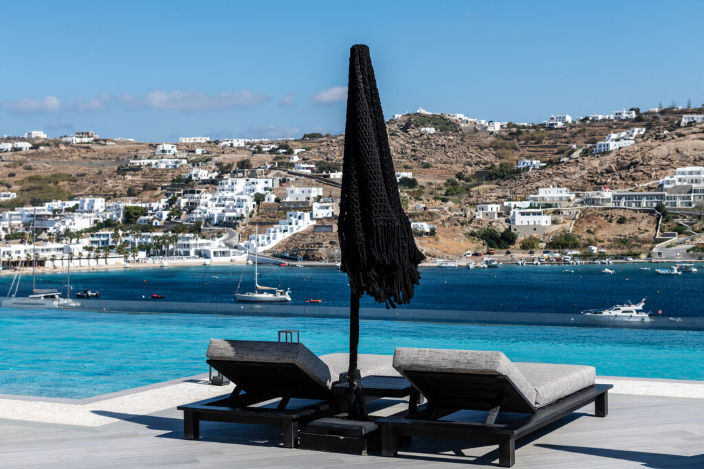coffee or evening cocktails with the glowing lights of Mykonos Town in the distance.